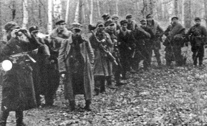 Żołnierze II batalionu por. Walerego Krokaya „Siwy” 43. pp 27. WDP AK, z pepeszą stoi Anastazy Garczyński, ze zb. A. Garczyńskiego |