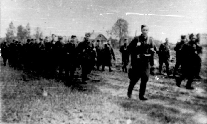 Władysław Kulwiec maszeruje z karabinem na ramieniu na czele swojej drużyny z 1. plutonu 1. Brygady Wileńskiej, ze zb. Tomasza Balbusa
