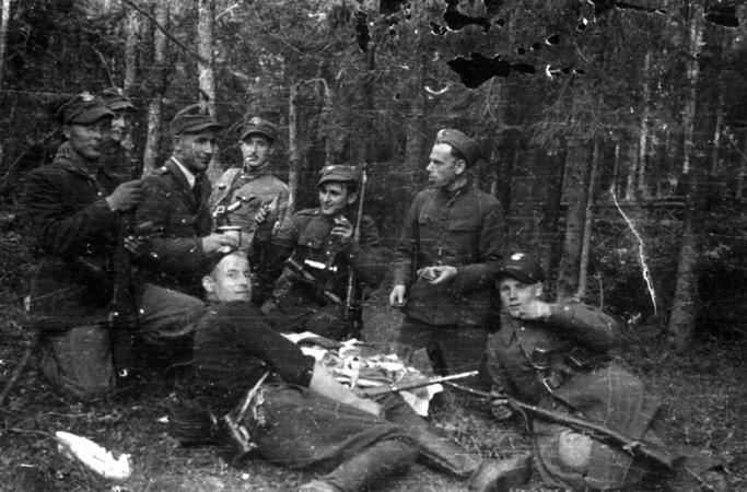 (w furażerce; z kanapką w ręce); Marian Poszewiecki „Kret” (w ciemnym berecie leży tyłem spoglądając na fotografa; przy pasie skórzany futerał z lornetką, polowa teczka i sowiecki granat obronny); trzeci od lewej por. Borys Sztark „Ptasznik” (z kubkiem w prawej ręce). Partyzant z karabinem siedzący na lewo od „Marka” w prawej ręce trzyma butelkę (z trunkiem wydanym z okazji przyjazdu por. „Ptasznika”), w lewej papierosa, za pasem ma wetknięty „handgranat”, przy pasku torby widoczna jasna latarka (maj 1944),