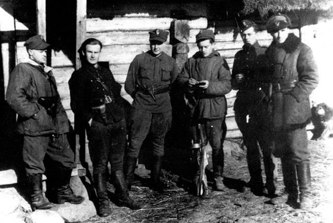 6. Samodzielna Brygada Dyspozycyjna AK na postoju w Butrymańcach, marzec 1944 r. od lewej: Wincenty Borodziewicz „Szkrab”, August Dobrowolski „Kruk”, Jarosław Jałyński „Góral”,