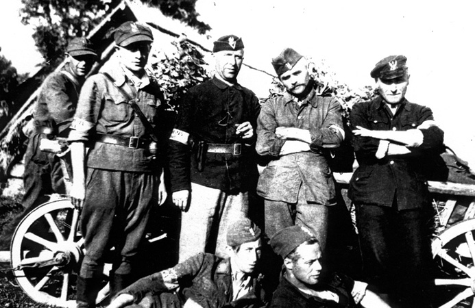 Żołnierze 7. Brygady „Wilhelma”, stoją od lewej: NN, Edward Poczepowicz „War”, Józef Chont „Czarny”, Józef Stępniak „Żywczyk”, Franciszek Kucha, pierwszy z lewej leży Jerzy Eberhardt „Grot”, Skorbuciany, lipiec 1944 r., ze zb. Muzeum Armii Krajowej Okręgu Wilno „Wiano” |
