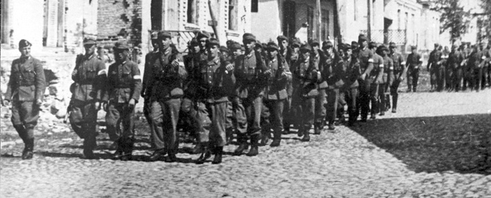 Kolumna 8. Brygady Wileńskiej maszerująca ze śpiewem przez wyzwolone miasteczko;