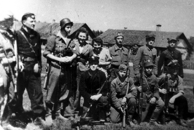 Żołnierze 36. Brygady „Żejmiana” na postoju we wsi Bujwidze, pierwszy z prawej stoi dowódca Brygady, por. Witold Kiewlicz „Wujek”, czerwiec 1944, ze zb. Muzeum Armii Krajowej Okręgu Wilno „Wiano”