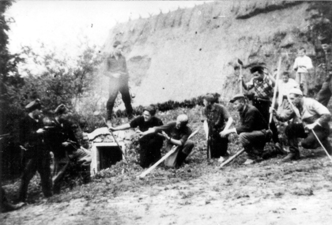 Oddział leśny 8. kompanii 26. pp w czasie ćwiczeń z pozorowaną bronią, na prawo od wejścia do piwnicy T. Sawiński „Pirat”, Milczyce, ze zbiorów Światowego Związku Żołnierzy Armii Krajowej Obszar