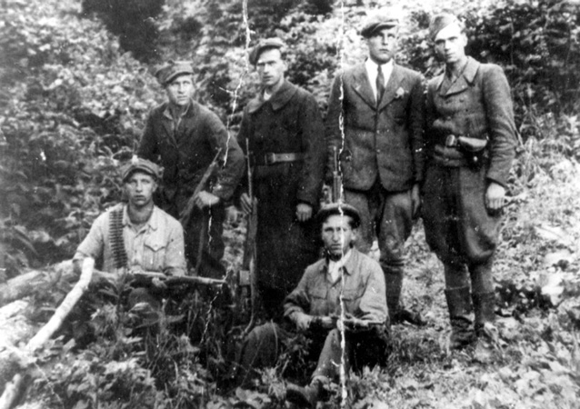 Żołnierze baonu A oddziałów leśnych „Warta” w Heluszu, stoją od lewej Jerzy Chromy „Pik”, Władysław Zajączkowski, dwaj NN, siedzi z lewej Józef Bielecki, z kolekcji J. Chromego ze zbiorów Światowego Związku Żołnierzy Armii Krajowej Obszar Lwów
