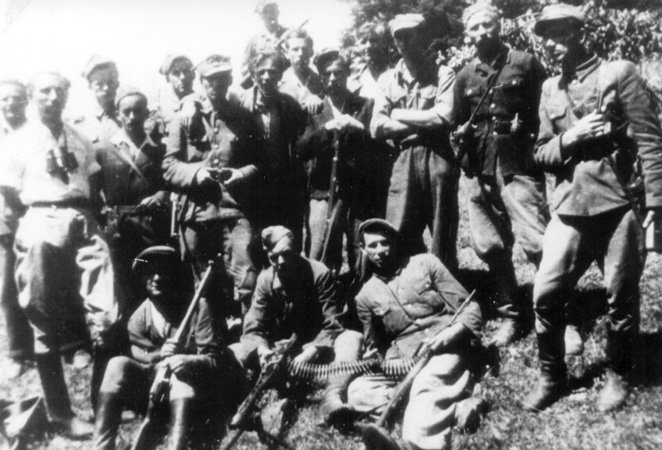 Stoją od lewej (z lornetką) ppor. Stanisław Popławski „Flis”, (bez czapki) ppor. Ludwig Jauernig „Kukułka”, (z rękami na piersi) plut. Jan Bułgajewski „Maryśka”, dalej st. sierż NN „Czarny Sęp”, pchor. Tadeusz Atamaniuk „Babinicz”, ze zbiorów Światowego Związku Żołnierzy Armii Krajowej Obszar Lwów |