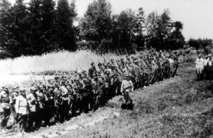 Przed frontem oddziału „Warta” stoi pchor. Antoni Wawro „Dziadek”, w grupie oficerów po prawej ppor. Stanisław Popławski „Flis”, NN i ppor. Ludwig Jauernig „Kukułka”, ze zbiorów Światowego Związku Żołnierzy Armii Krajowej Obszar Lwów