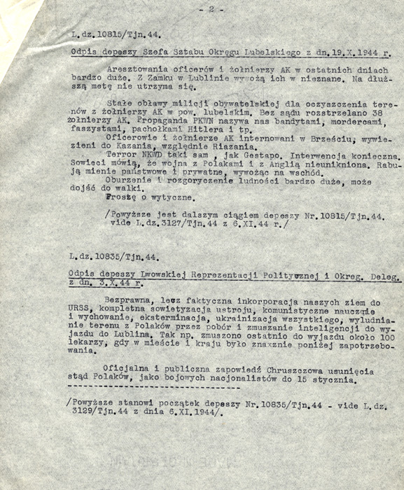 Odpis depeszy Komendanta Okręgu Lublin AK, ze zb. Marka Ney-Krwawicza - 2 str. |