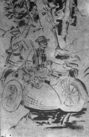 22 lipca 1944 r. I batalion por. Franciszka Pukackiego „Gzyms” z 45. pp w zasadzce pod Firlejem zdobył motocykl i przekazał go por. Bronisławowi Ciszkiewiczowi, oficerowi do specjalnych poruczeń sztabu dywizji, autor karykatury nieznany, ze zb. Światowego Związku Żołnierzy Armii Krajowej Okręg Wołyń |