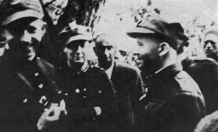 Oficerowie 27 WDP AK podczas święta batalionu „Jastrzębia”, stoją od lewej por. Michał Fijałka „Sokół”, ppor. Mścisław Sławomirski „Prawdzic”, NN, mjr Jan Swatowski „Kowal”, Rudka Kijańska, lipiec 1944,