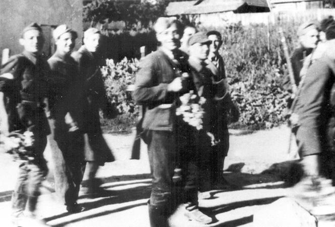 W drodze na Warszawę, mjr Witold Paweł Szredzki „Sulima” i NN „Sum” w otoczeniu żołnierzy Zgrupowania „San”, ze zbiorów Światowego Związku Żołnierzy Armii Krajowej Obszar Lwów