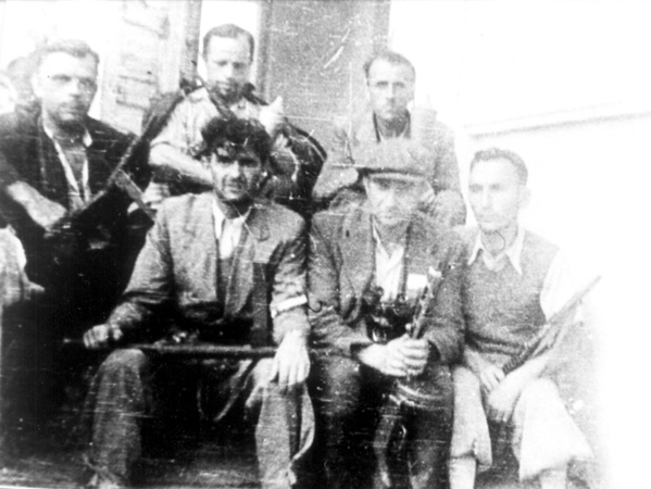 Żołnierze plutonu Antoniego Jazłowieckiego „Ajot” (siedzi z pistoletem maszynowym na kolanach) w czasie odpoczynku po akcji, ze zb. Andrzeja Zagórskiego