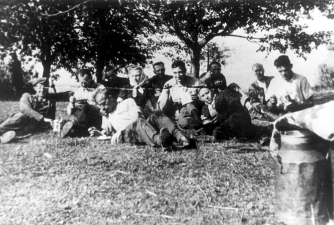 Żołnierze plutonu Antoniego Jazłowieckiego „Ajot” w czasie posiłku. Budziwoj, lipiec 1944, ze zb. Andrzeja Zagórskiego |