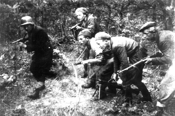 Patrol dywersyjny Józefa Lenara „Piłka” w lasach Woli Zarczyckiej, od lewej Tadeusz Krzan „Oczko”, Tadeusz Szymończyk, Jerzy Fleszar „Jeżyk”, Jan Szymończyk, Mieczysław Smoliński „Bob”, czerwiec 1944, ze zb. Andrzeja Zagórskiego