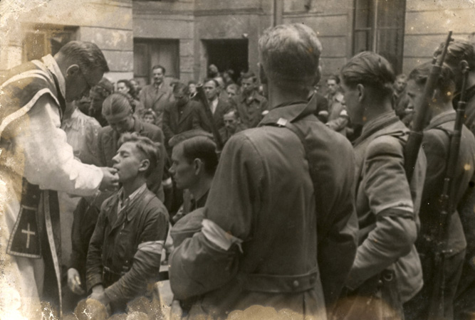 Komunia święta w czasie mszy polowej na jednym z warszawskich podwórek, ze zb. Marka Ney-Krwawicza |