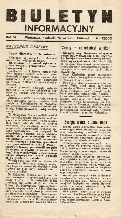 „Biuletyn Informacyjny” z 24 września 1944 r. z informacją o sowieckich zrzutach broni przeciwpancernej