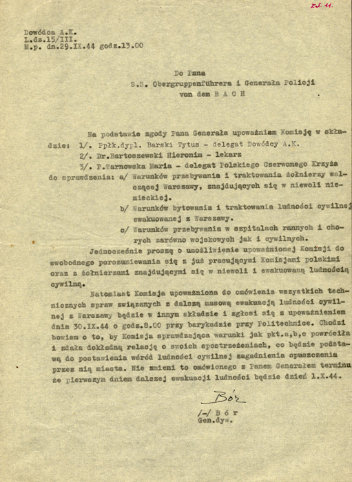 Pismo gen. Tadeusza Komorowskiego „Bór” do dowodzącego po stronie niemieckiej Ericha von dem Bacha w sprawie sytuacji ludności cywilnej, ze zb.Marka Ney-Krwawicza