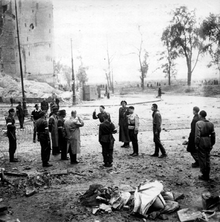 Pożegnanie gen. Tadeusza Komorowskiego „Bór” z oficerami batalionu „Golski” na placu przed Politechniką Warszawską 5 października 1944 r., ze zb. Marka Ney-Krwawicza
