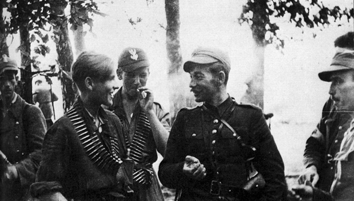 Por. Jerzy Sztajgierwald „Rozłóg” w rozmowie z żołnierzami swojej 6. kompanii 2 pp leg. AK w chwilę po przekazaniu rozkazu marszu na Warszawę, 15 sierpnia 1944, fot. Jan Jakóbiec, J. Jakóbiec, R. Wójcikowski, My Armii Krajowej Żołnierze, Warszawa 1992 |