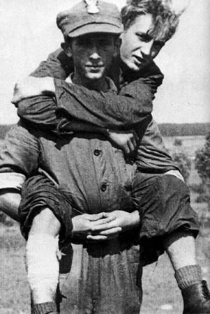 Rannego pod Ninkowem Witolda Drozdowskiego „Lot” koledzy wynieśli z pola walki na plecach, sierpień 1944, fot. Jan Jakóbiec, J. Jakóbiec, R. Wójcikowski, My Armii Krajowej Żołnierze, Warszawa 1992