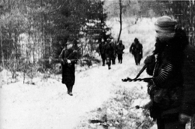 Por. Krzysztof Hofman „Cyprian” egzaminuje szkolonych do ostatnich dni kursantów Szkoły Podchorążych Piechoty, grudzień 1944, fot. Jan Jakóbiec,