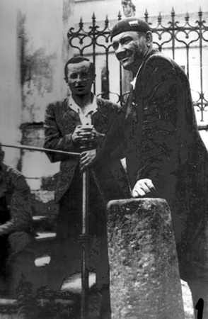 Por. Franciszek Pudo „Sokół” (w berecie) i sierż. pchor. Tadeusz Sabas „Olszyna” na schodach kościoła