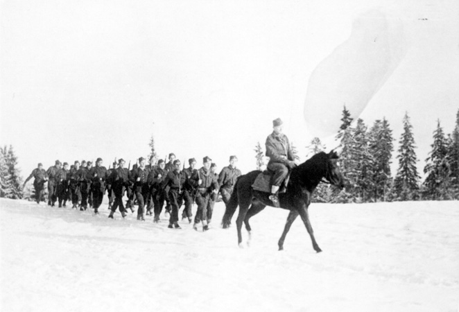 Jedna z kompanii 1. psp w szyku zwartym maszeruje na mszę świętą, ze zb. Andrzeja Zagórskiego |