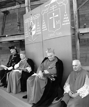 Biskup Karol Wojtyła i kardynał Stefan Wyszyński na tle rusztowań budowanej „Arki Pana” 5 maja 1977 r.