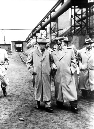 Bułganin, Żukow i Jędrychowski w kombinacie w lipcu 1956 r.; fot. Otto Link.