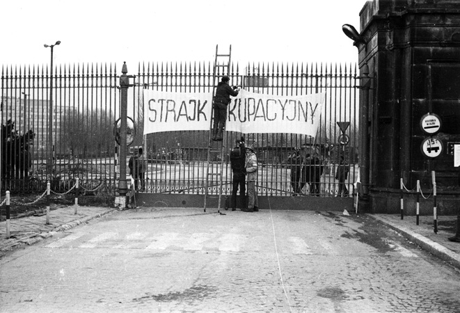 Wywieszanie transparentu na bramie głównej Huty im. Lenina w Krakowie 13 grudnia 1981 r.;