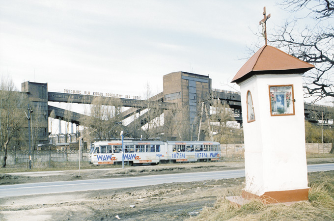 Współczesny wagon tramwajowy z reklamami, w tle zamierający kombinat; fot. Adam Gryczyński.