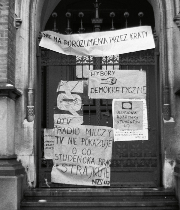 Gmach Collegium Novum UJ w czasie strajku solidarnościowego z Wyższą Szkołą Inżynierską w Radomiu,