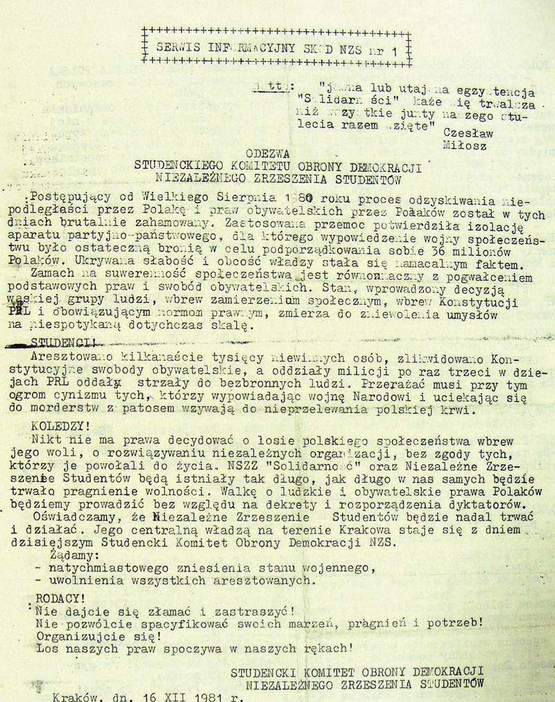 Odezwa Studenckiego Komitetu Obrony Demokracji NZS, 16 grudnia 1981 r.