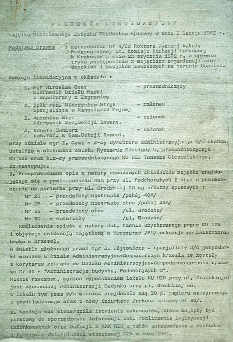 Pierwsza strona protokołu likwidacyjnego majątku NZS WSP w Krakowie,