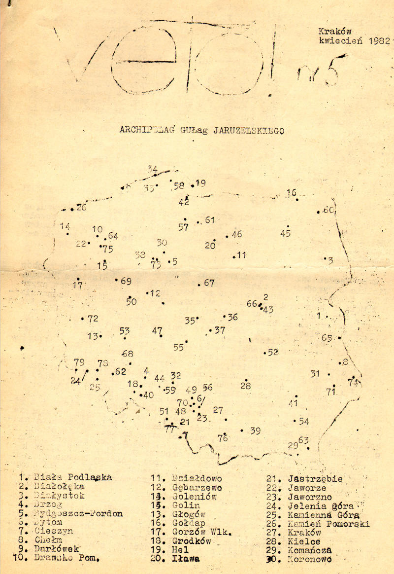 Okładka konspiracyjnego pisma „Veto" z zaznaczonymi obozami internowania, kwiecień 1982 r.