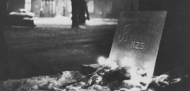 Tablica upamiętniająca drugą rocznicę rejestracji NZS, u wylotu ulicy Jagiellońskiej,