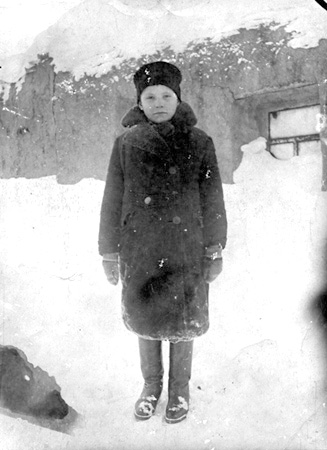 Wacław Myśliwiec, trzynastolatek. W tle zasypana śniegiem aż po okna chatka w Presnogorkowce,