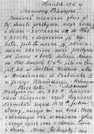 List z obozu w Kozielsku pisany do osoby pośredniczącej w kontaktach z rodziną, napisany tak aby jego prawdziwy sens był zrozumiały tylko dla bliskiej rodziny.