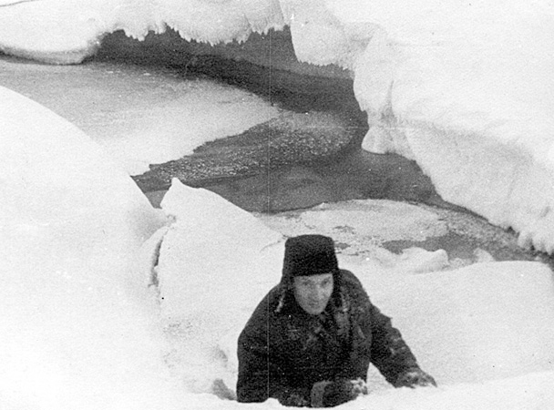 Józef Halski stojący w głębokim śniegu, w tle zasypana po dach hala fabryczna. |