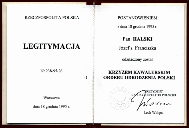 Legitymacja Krzyża Orderu Odrodzenia Polski.