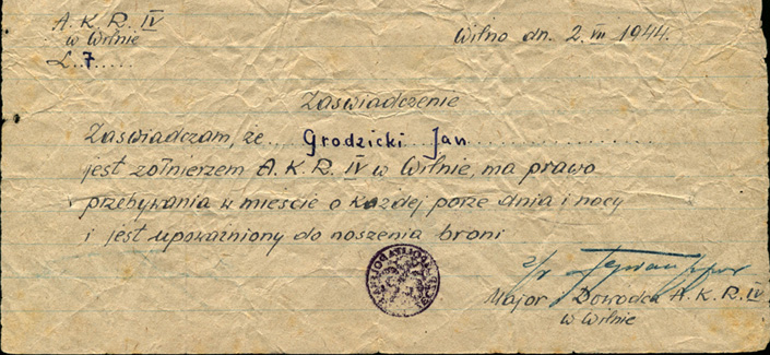 Zaświadczenie Komendanta Garnizonu Wileńskiego AK.
