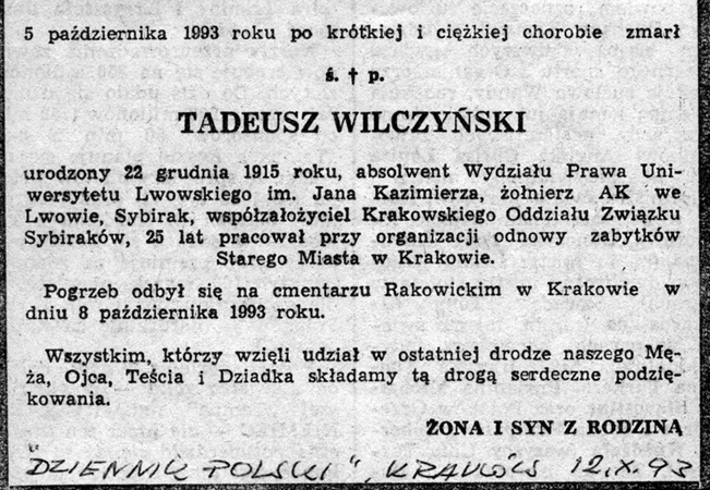 Nekrolog Tadeusza Wilczyńskiego.