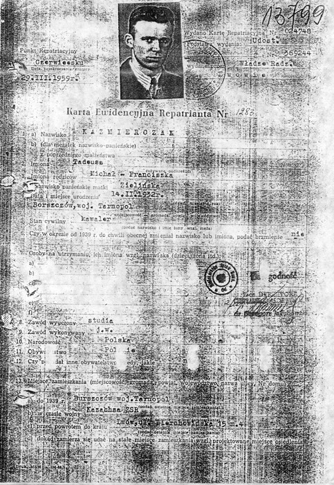 Karta ewidencyjna repatrianta Tadeusza Kaźmierczaka.