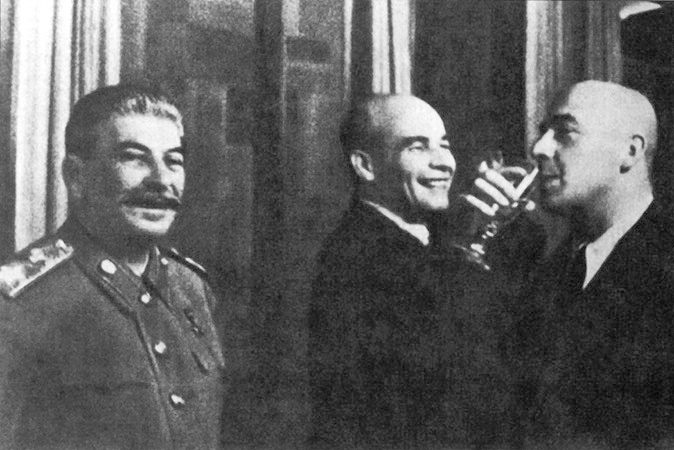 Władysław Gomułka (w środku) i Józef Cyrankiewicz (po prawej) w czasie jednej z wizyt u Józefa Stalina w Moskwie. |