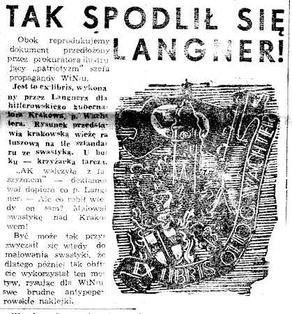 z okupantem niemieckim, stawiany niektórym oskarżonym. Aby udowodnić im współpracę z hitlerowcami chwytano się wszelkich sposobów. Exlibris, wykonany przez Langnera na zamówienie szefa dystryktu krakowskiego Otto Wächtera oraz artykuł prasowy, wykorzystujący ten fakt do szkalowania autora exlibrisu.