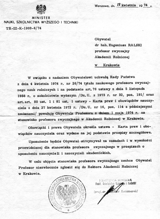 Nadanie tytułu profesorskiego Eugeniuszowi Ralskiemu.