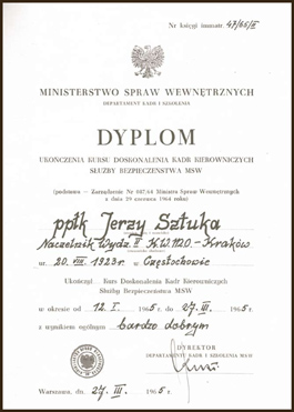 | Świadectwo ukończenia przez Józefa Mieleckigo Dwuletniej Szkoły Oficerskiej SB MSW | Dyplom ukończenia przez Jerzego Sztukę kursu doskonalenia kadr kierowniczych SB MSW |