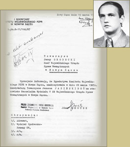 | Akceptacja Komitetu Wojewódzkiego PZPR w Nowym Sączu powołania Janusza Jasińskiego na stanowisko Naczelnika Wydziału V SB WUSW w Nowym Sączu | Uchwała egzekutywy Komitetu Wojewódzkiego PZPR w Nowym Sączu o odwołaniu Naczelnika Wydziału Paszportów SB KW MO w Nowym Sączu Jana Bądka |