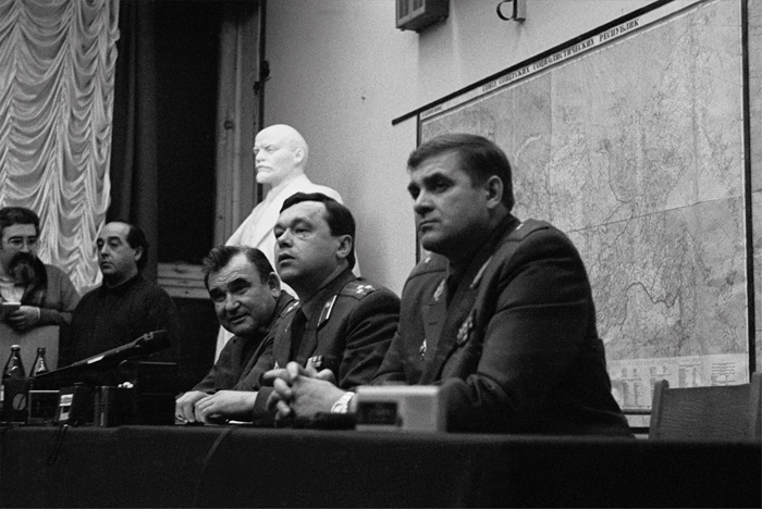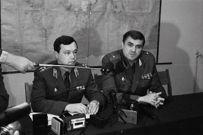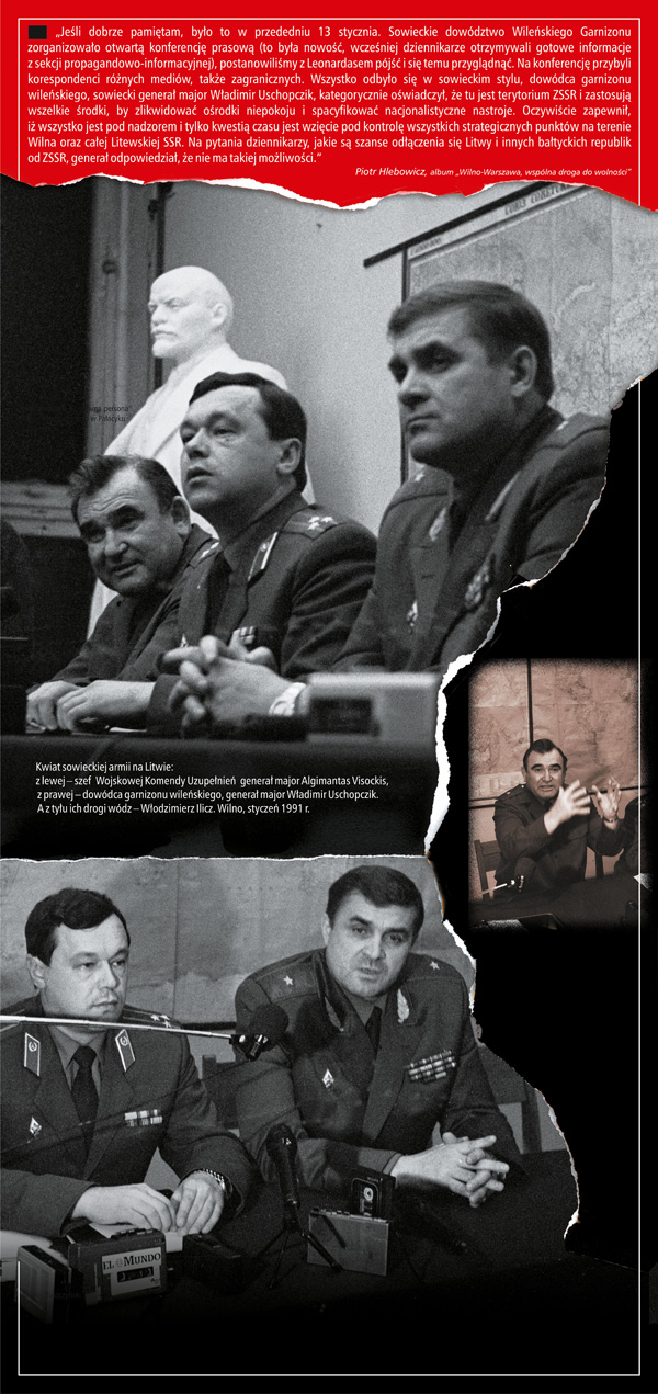 Jeśli dobrze pamiętam, było to w przededniu 13 stycznia. Sowieckie dowództwo Wileńskiego Garnizonu zorganizowało otwartą konferencję prasową (to była nowość, wcześniej dziennikarze otrzymywali gotowe informacje z sekcji propagandowo-informacyjnej), postanowiliśmy z Leonardasem pójść i się temu przyglądnąć. Na konferencję przybyli korespondenci różnych mediów, także zagranicznych. Wszystko odbyło się w sowieckim stylu, dowódca garnizonu wileńskiego, sowiecki generał major Władimir Uschopczik, kategorycznie oświadczył, że tu jest terytorium ZSRS i zastosują wszelkie środki, by zlikwidować ośrodki niepokoju i spacyfikować nacjonalistyczne nastroje. Oczywiście zapewnił, iż wszystko jest pod nadzorem i tylko kwestią czasu jest wzięcie pod kontrolę wszystkich strategicznych punktów na terenie Wilna oraz całej Litewskiej SRS. Na pytania dziennikarzy, jakie są szanse odłączenia się Litwy i innych bałtyckich republik od ZSRS, generał odpowiedział, że nie ma takiej możliwości.