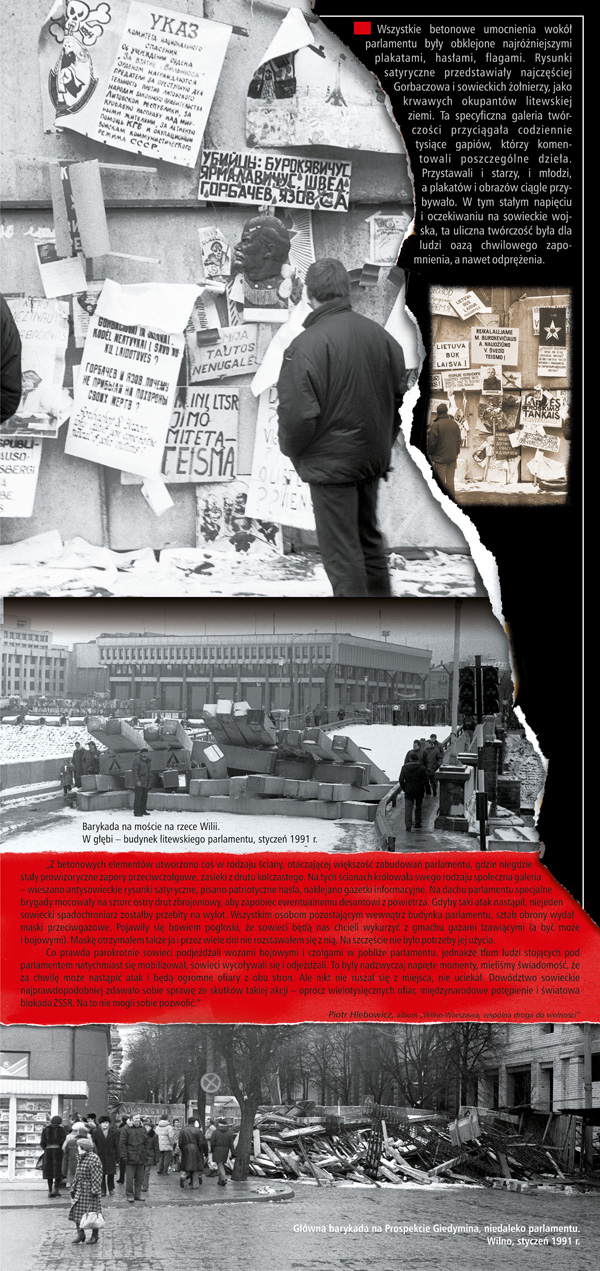Wszystkie betonowe umocnienia wokół parlamentu były poobwieszane najróżniejszymi plakatami, hasłami, flagami. Rysunki najczęściej przedstawiały Gorbaczowa i sowieckich żołnierzy jako krwawych okupantów litewskiej ziemi. Ta specyficzna galeria przyciągała codziennie tysiące gapiów, którzy komentowali poszczególne dzieła. Przystawali i starzy, i młodzi, a plakatów i obrazów ciągle przybywało. W stałym napięciu i oczekiwaniu na sowiecką interwencję ta uliczna twórczość była dla ludzi oazą chwilowego zapomnienia, a nawet odprężenia.